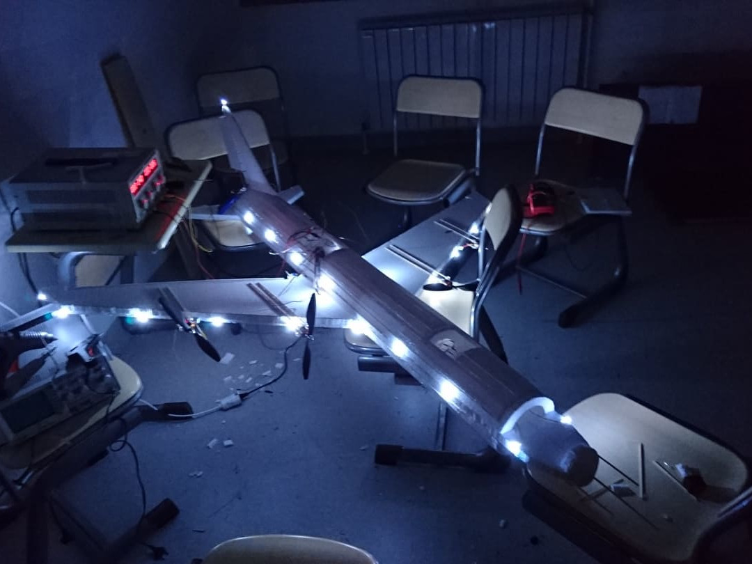 The airplane is battery powered, it is driven by brushless DC motors, the "brain" is ESP32 microcontroller, programmed